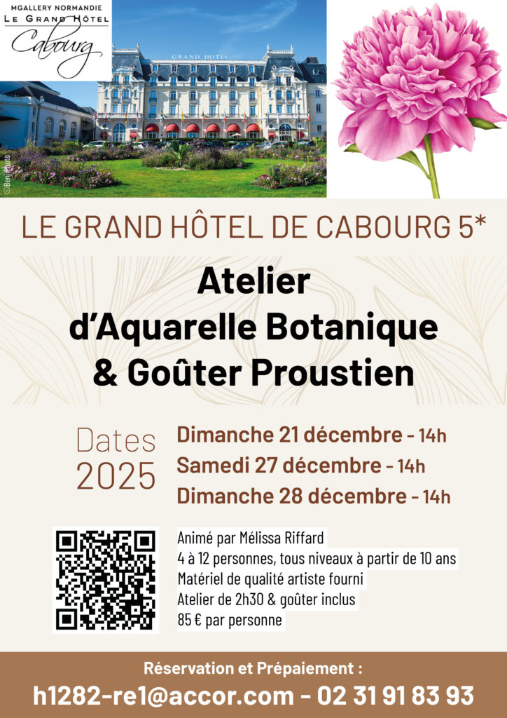 Durée : 2h30 d’atelier de 14h à 16h30, suivi d’un goûter comprenant madeleines et boisson chaude au sein du Grand Hôtel de Cabourg