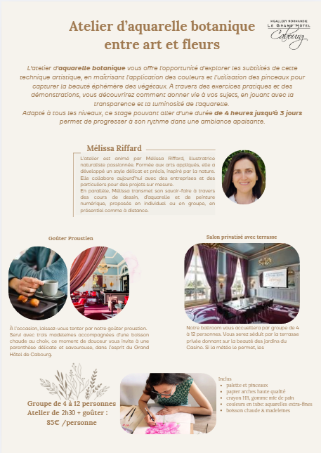 Il s’agit d’un atelier d’initiation à l’aquarelle botanique ouvert à tous les niveaux, suivi d’un goûter proustien, en hommage à l’écrivain Marcel Proust qui a séjourné au Grand Hôtel. Le matériel de qualité artiste est fourni. Vous retrouverez les informations pratiques ci-dessous.